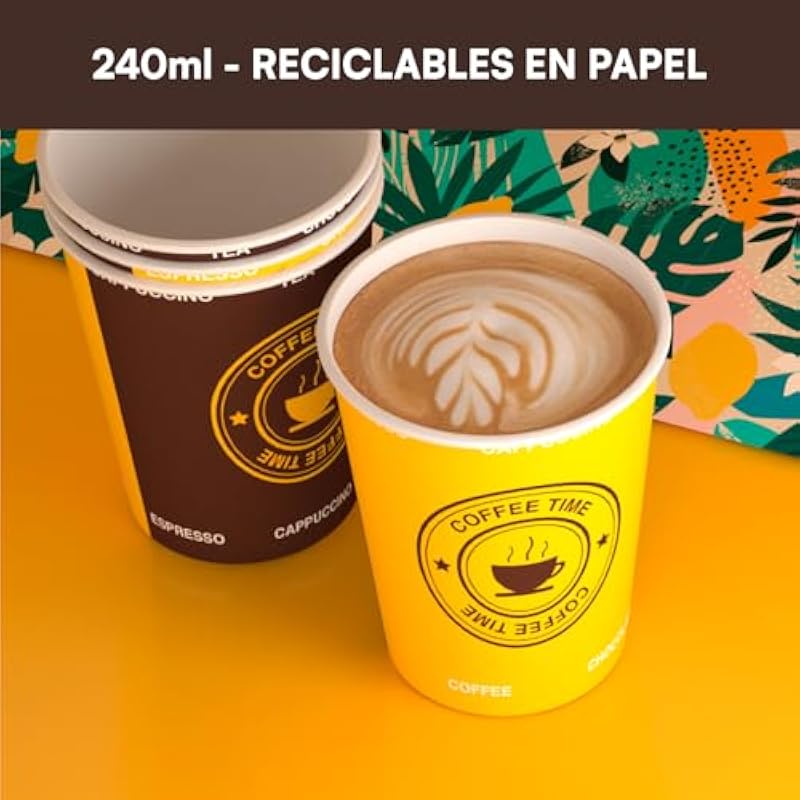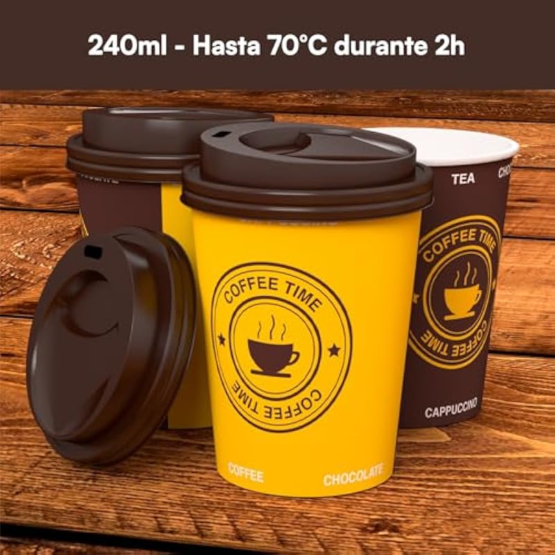 100 Paper Cups 240 ml Ecological Biodegradable Disposable Take Away Hot Drinks Water Colour + 100 Lids with Spout