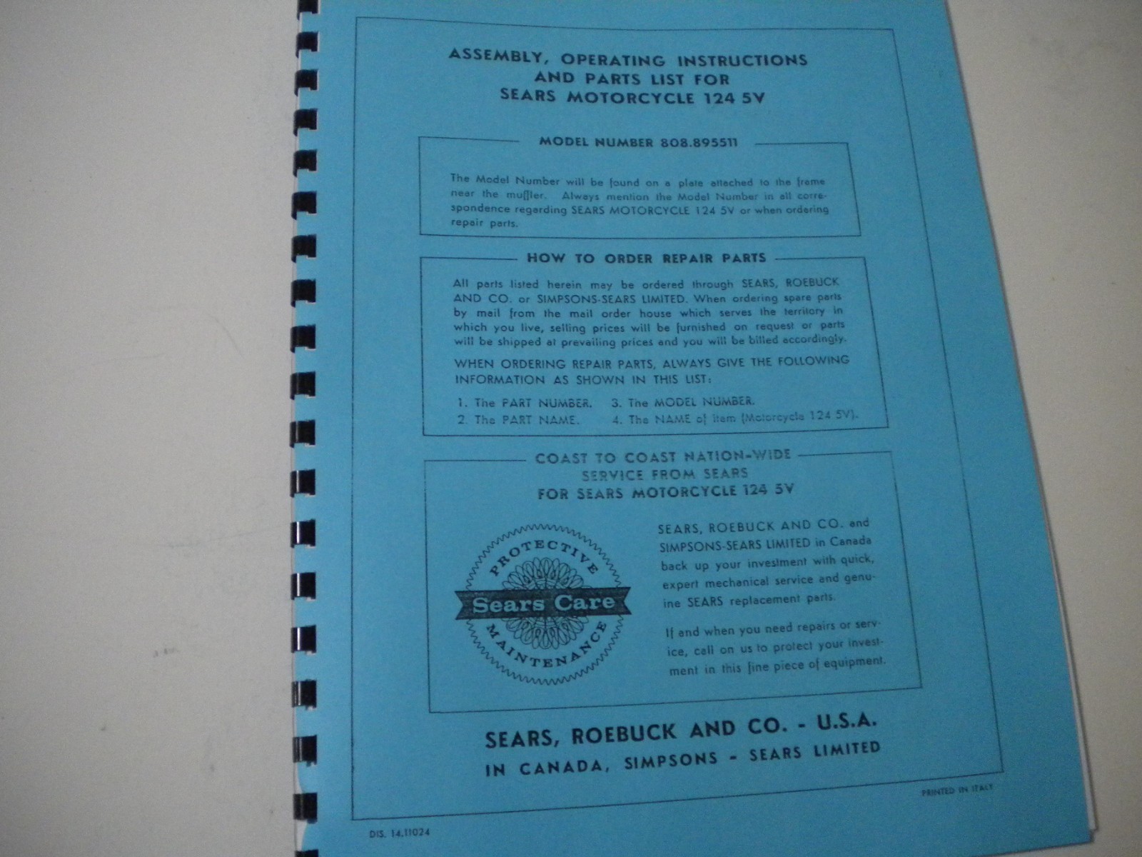 1960’s Sears Allstate 124 5V Motorcycle Parts & Service Manual-NEW