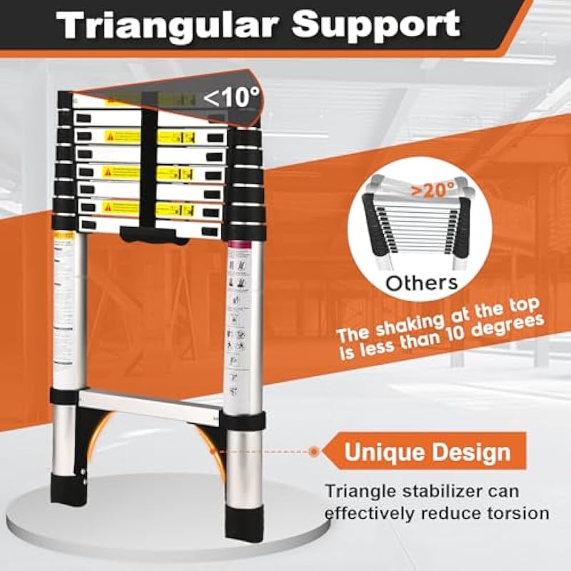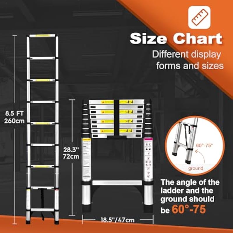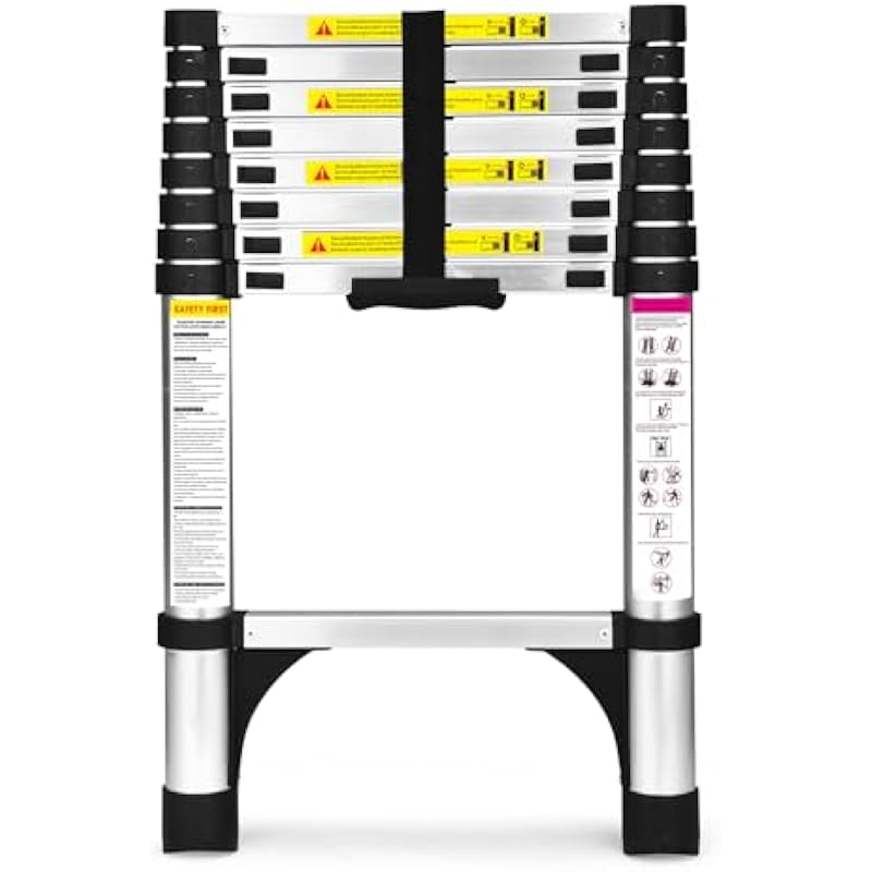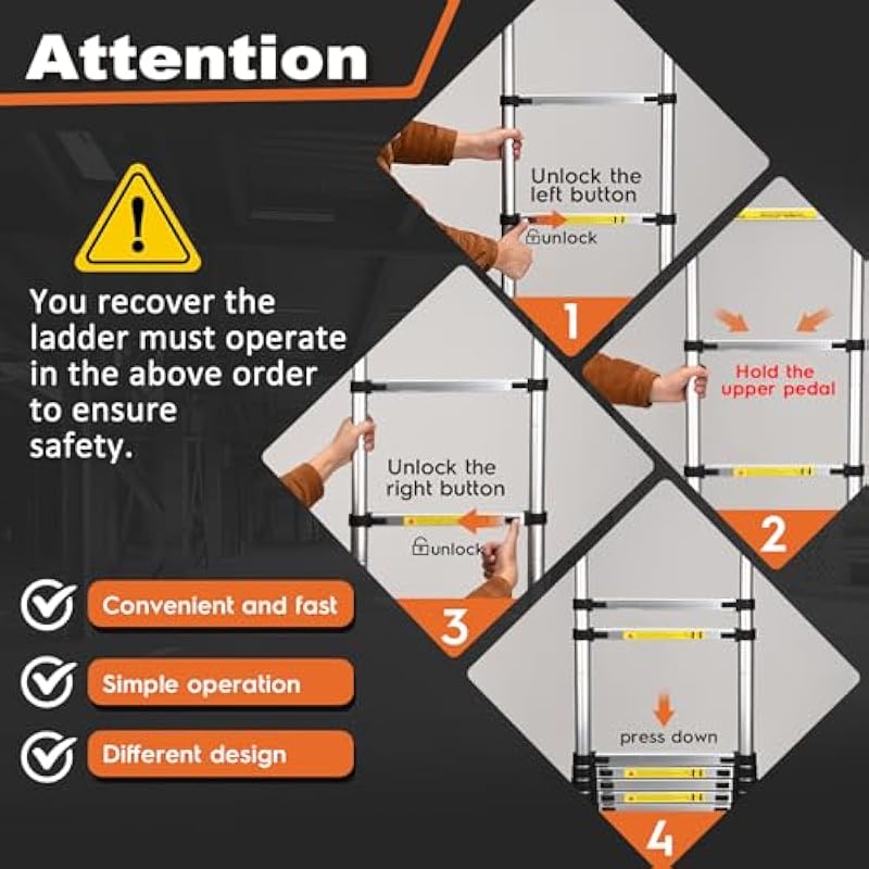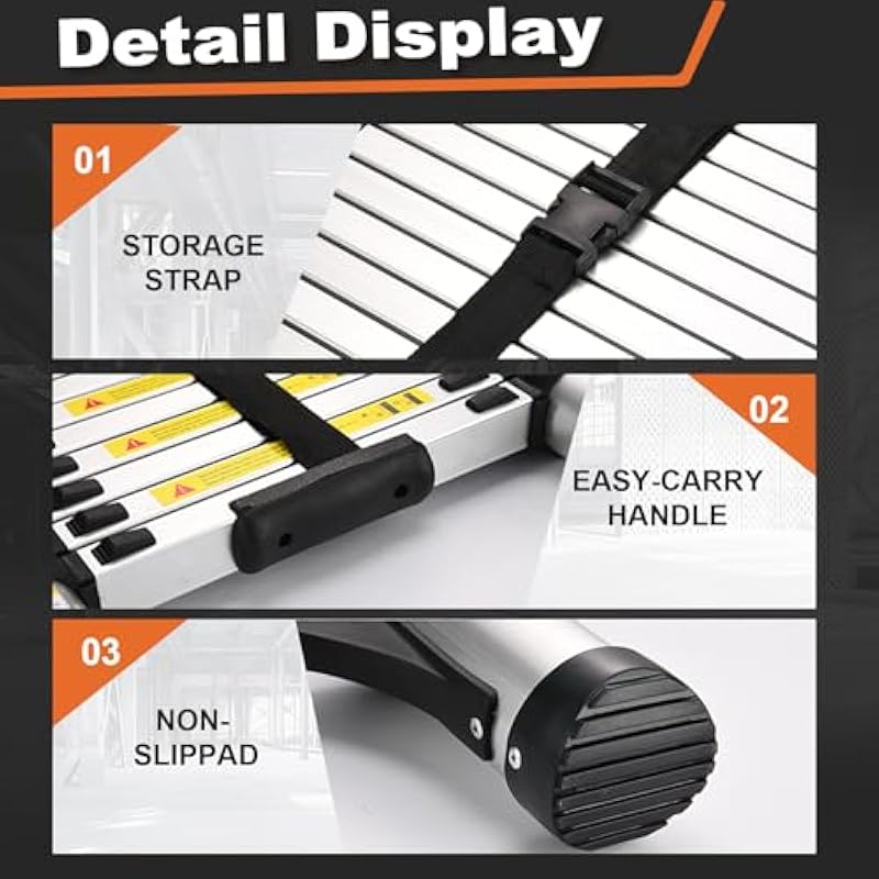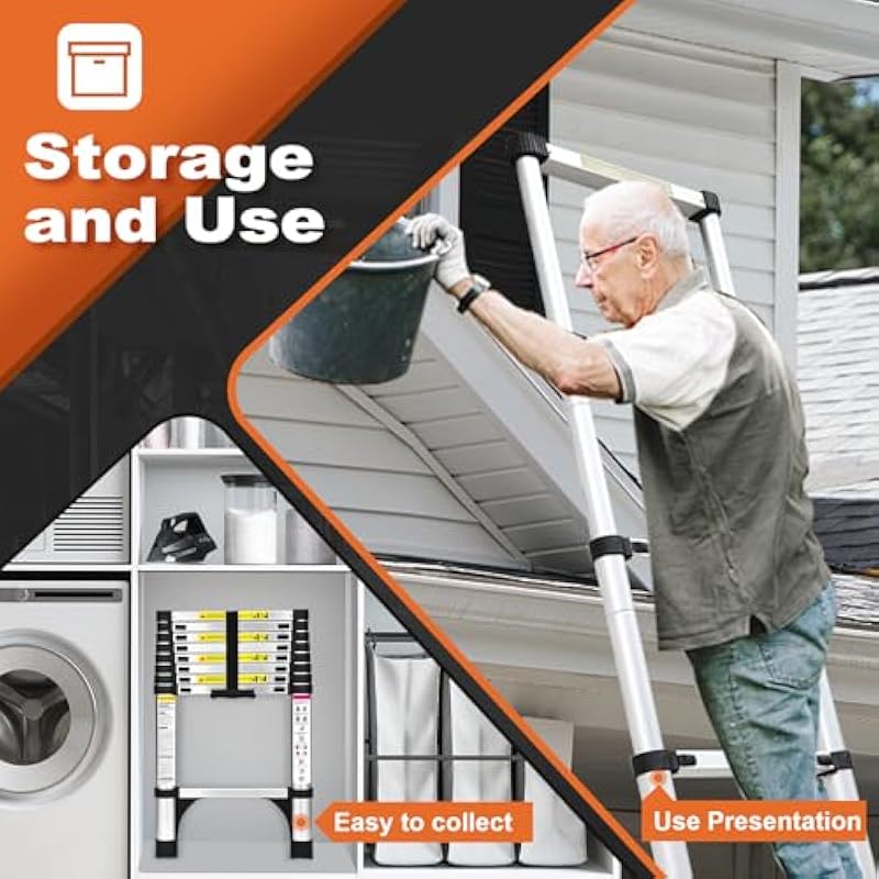 - EASY TO CARRY AND STORE The aluminum telescopic ladder is lighter and more portable than stainless steel ladders, making it easier to carry and carry. It can be easily folded to a very small size for storage in corners, storage rooms or car trunk, making it ideal for professionals or home users who frequently need to move the folding ladder.