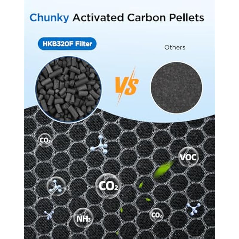 - 【3-Stage Filtration System】Our HKB320F filter replacement includes 3 filtration system,activated carbon filter with more pellets helps remove household odors, pet smells, smoke, VOCs, and other common pollutants for fresher.
