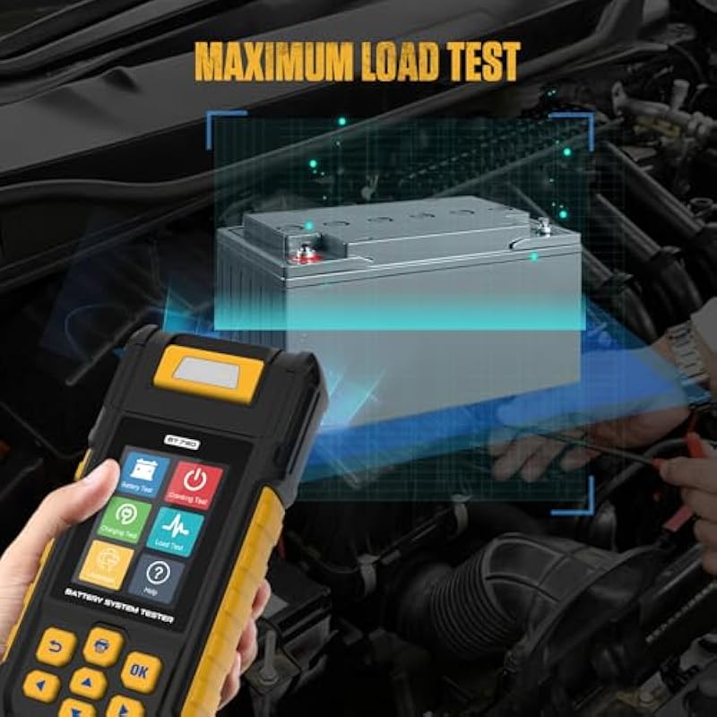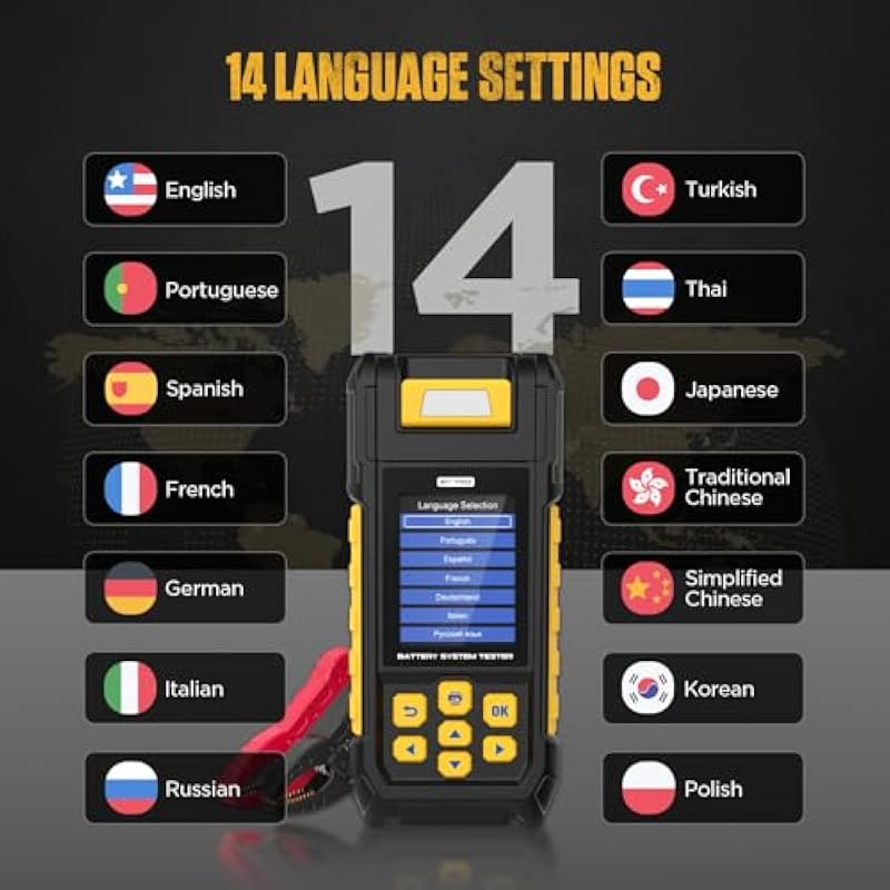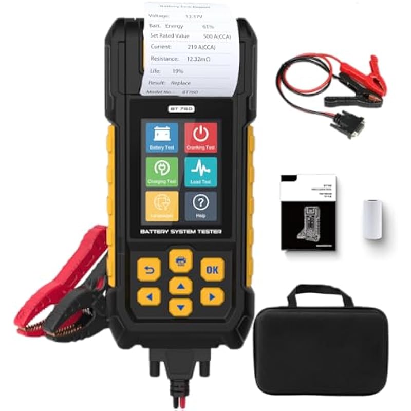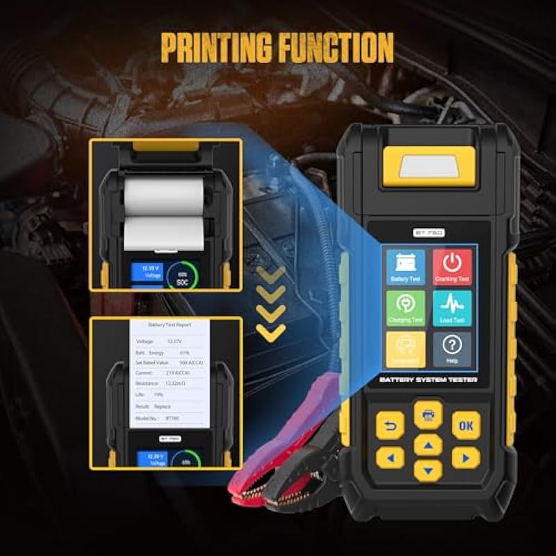 - Battery Tester 2.8” LCD Screen with Printer: The built-in printer uses standard thermal printer paper, you can easily get a print and save the paper records for future reference. Its large backlit LCD screen helps you quickly diagnose and solve car health problems in any lighting conditions. Support 12 languages, such as English, French, Spanish, etc.