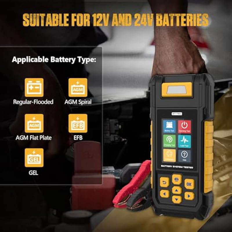 - Wide Applications –The car battery charge tester is used for all 6V, 12V, 24V (20-3000 CCA) lead-acid batteries, including regular batteries, flat plate AGM, spiral AGM and GEL batteries for cars, motorcycles, light trucks and boats. , lawn mower, etc. Based on CCA, BCI, CA, MCA, JIS, DIN, IEC, EN, SAE and GB vehicle battery standards.