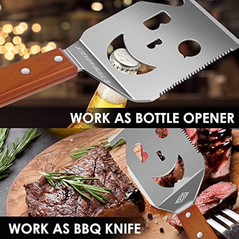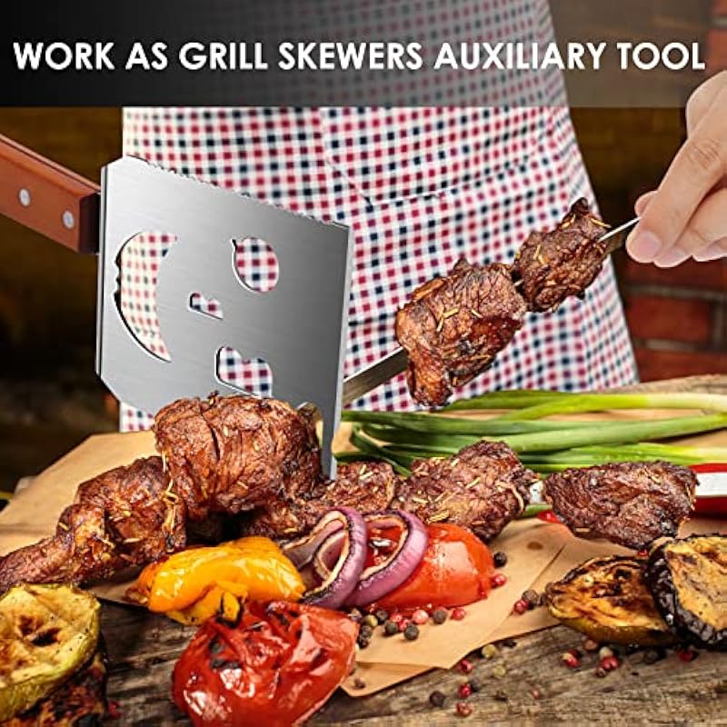 - HEAVY DUTY BARBECUE UTENSILS Multifunction Grill Tool – Extra Thick Strong Spatula – Never Bend, Wobble or Fall Off – Large Enough – Smooth Surface – Easy to Use and Clean – Hand Wash Required – Extra Long Wooden Handle – No More Singing Arm Hair, Anti-Scald