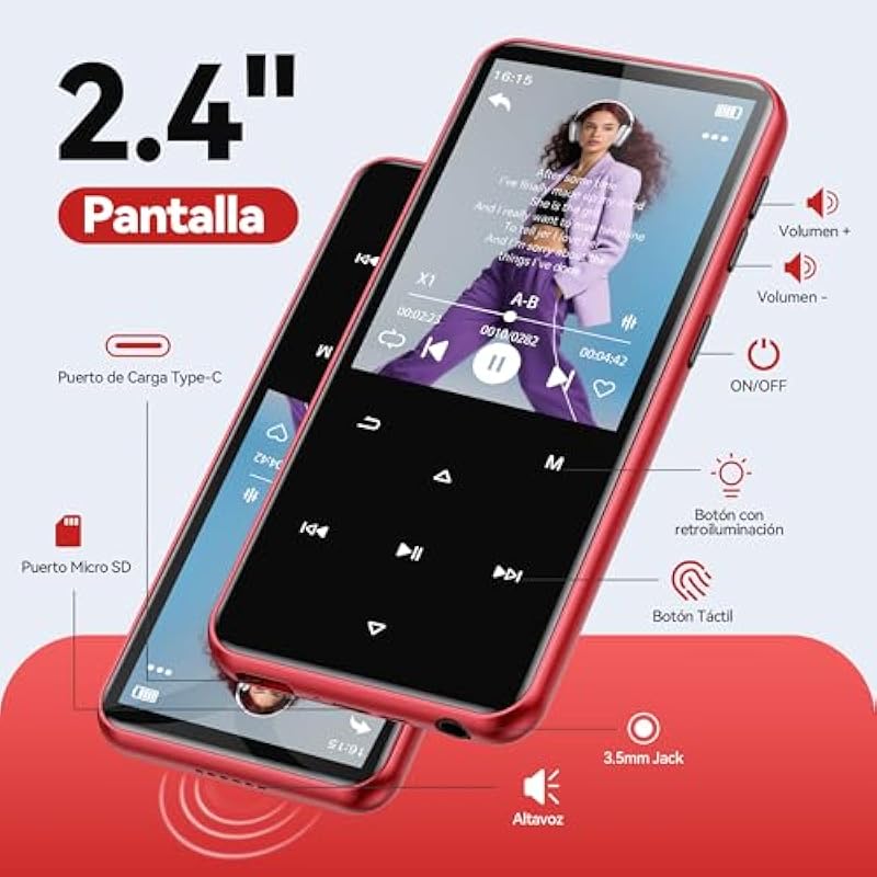 AGPTEK 64GB Bluetooth 5.3 MP3 Player with 2.4″ TFT Color Screen, MP3 Player for Kids with Speaker, Touch Buttons, FM Radio, E-Book, Recording, Support up to 128