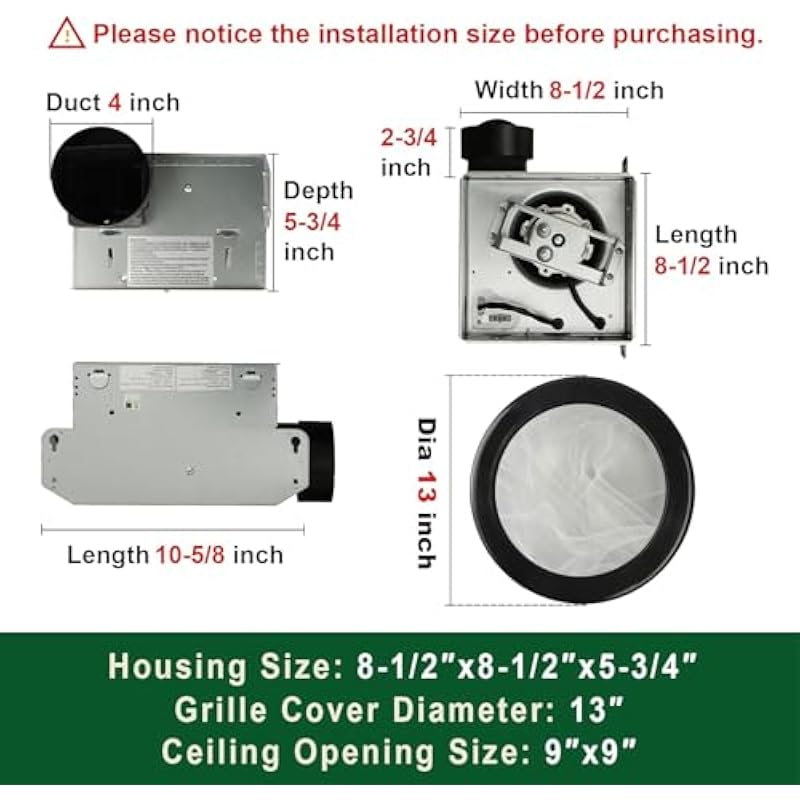 - EASY INSTALLATION: The bathroom fans for ceiling is easy to install or replace existing product for DIY’ers with no attic access required. Housing Dimensions 8-1/2″ x 8-1/2″ x 5-3/4″. Light Cover diameter is φ13. Click the installation guide on this page for more details and professional instruction