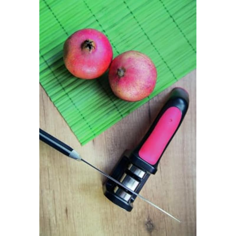 - ERGONOMIC DESIGN: It is comfortable and easy to use as you don’t have to make a lot of effort. It has an ergonomic handle to keep it fixed while sharpening. Design in red combined with black.