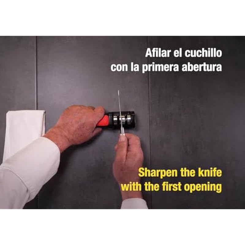 - QUALITY: The manual sharpener with handle has been provided with ceramic and carbon rollers to ensure a renewed and effective edge on the different knives.