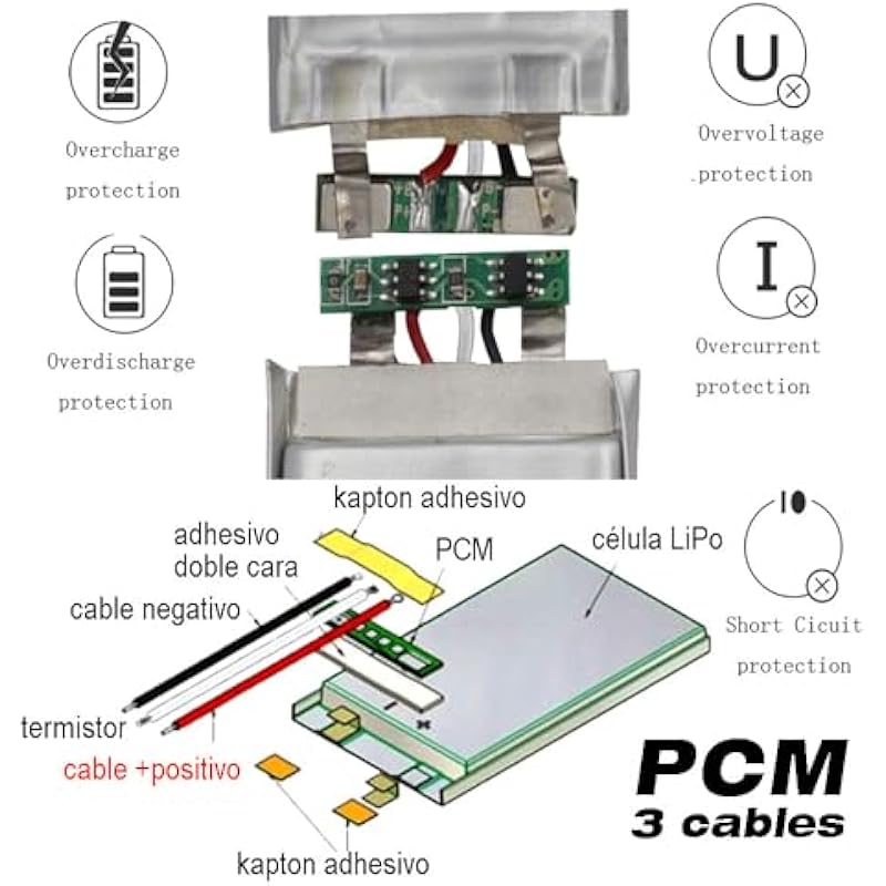 - ⚡PCM PROTECTION WITH NTC:Built-in PCM protection circuit with NTC thermistor to prevent overcharging or over-discharging. Protection function: overcharge, over discharge, over current, short circuit protection, over temperature protection. Can be recharged repeatedly. No memory effect thanks to the latest Li-Ion technologies.