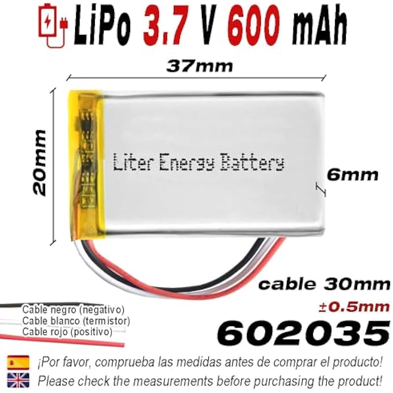 - ⚡Specifications -> Model: 802035 | Size: 37x20x8 ±0.5mm | 3 Cables | Rated Voltage: 3.7V | Rechargeable Lithium Ion Battery 3.7V | 1 Cell | No connector with PCM protection and NTC thermistor | Red wire is positive “+” Black is Negative “-“, the white is “thermistor”, do not connect in reverse direction.