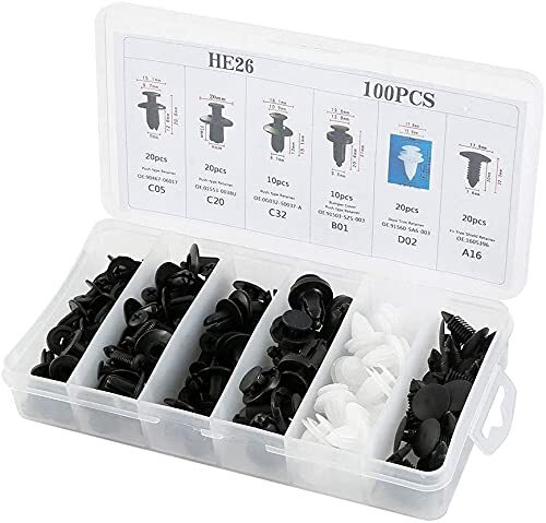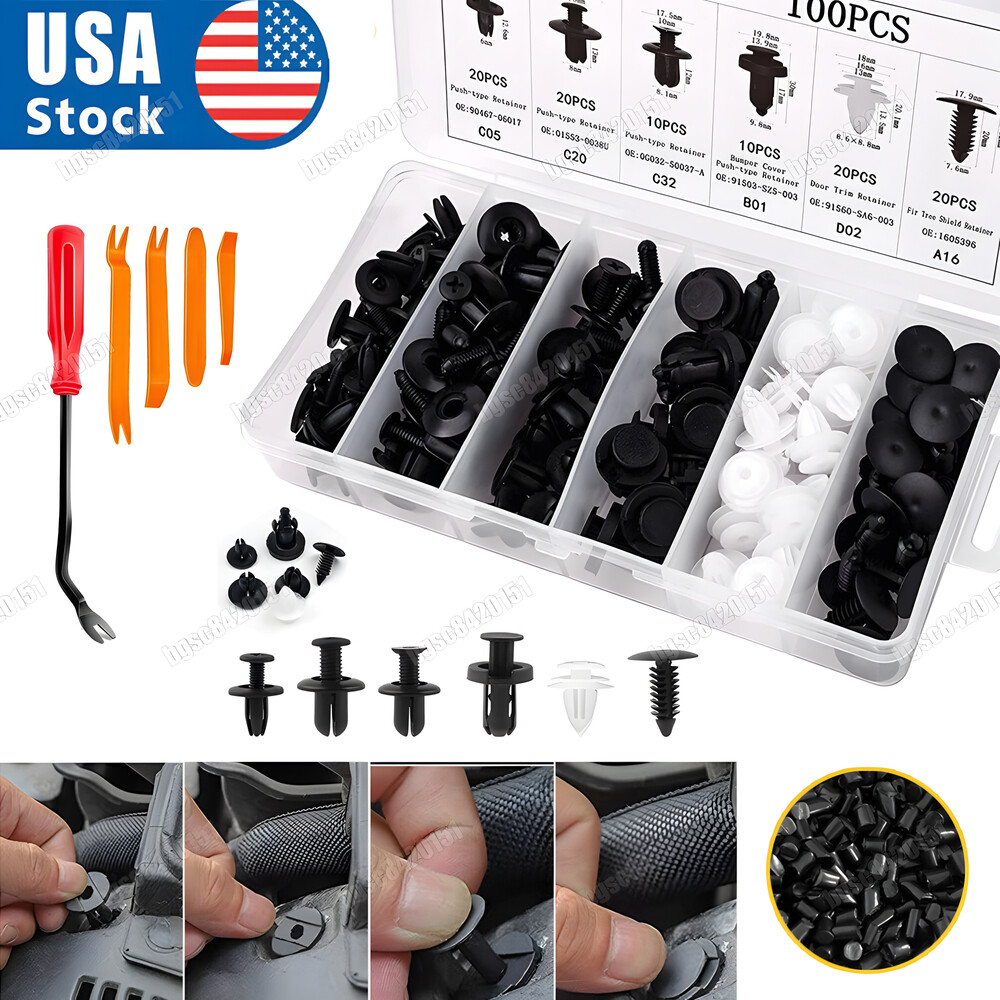 100pcs Clips, 1 Plastic Box,4 Fastener Removers