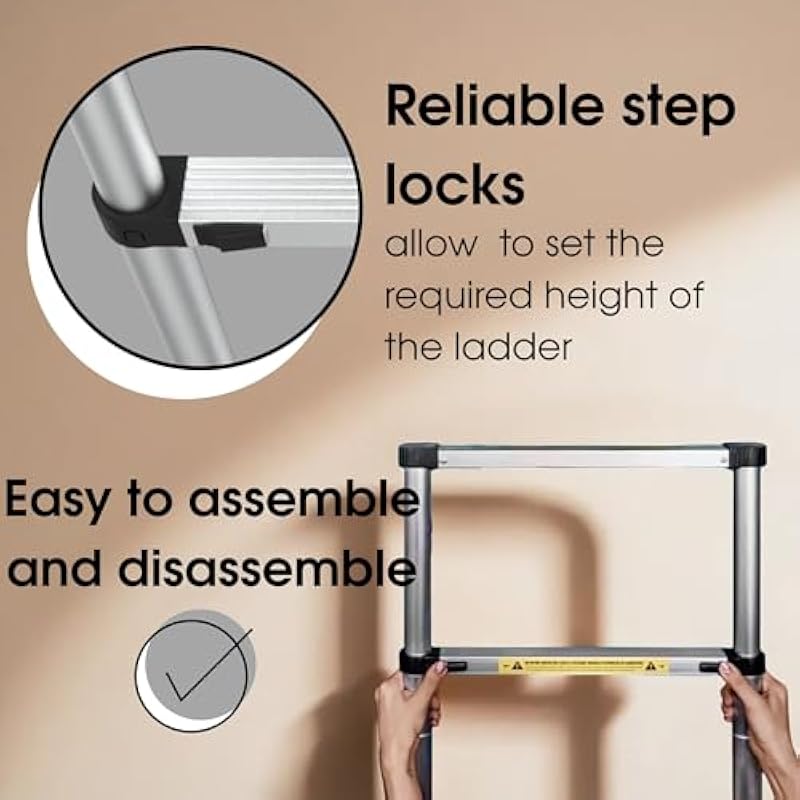 - LIGHTWEIGHT & DURABLE DESIGN – Made with high quality materials, this telescopic ladder is lightweight for easy transport and durable enough for long time use. CERTIFIED SAFETY YOU CAN TRUST – Fully certified to meet safety standards, recommended by both professionals and DIY users.