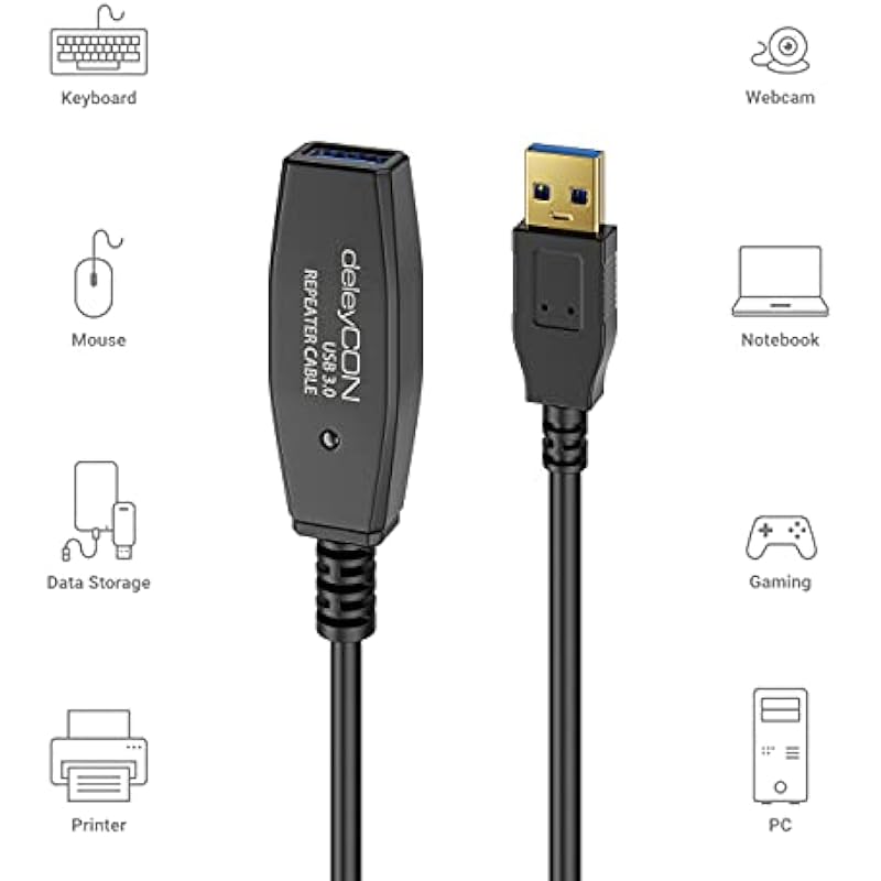- deleyCON USB 3.0 Active Cable 10m // USB Active Extension Cable // Fast and secure data transmission with up to 5GBit/s (USB 3.0 Superspeed)