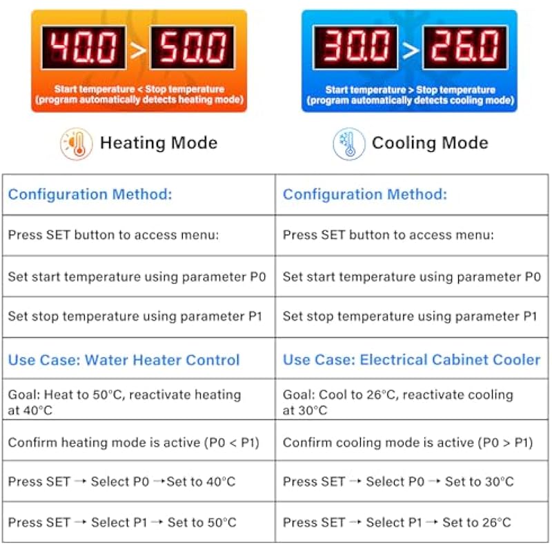 - 【Working Mode】 Two working modes: Warming (the starting temperature is lower than the stop temperature), cooling (the starting temperature is higher than the stop temperature).