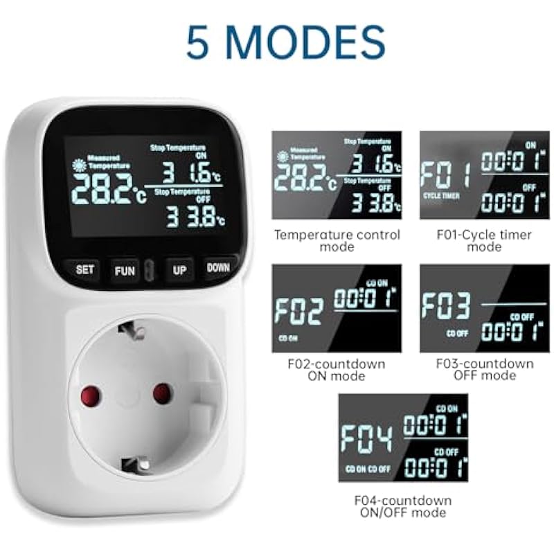- 5 TEMPERATURE CONTROL MODES: temperature control mode; F01 cycle timer mode; F02-countdown-ON mode, F03 countdown mode, F04 countdown mode and countdown mode. Please note that the temperature control function and the time function cannot be used simultaneously.