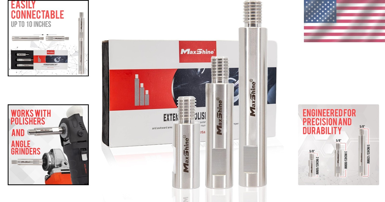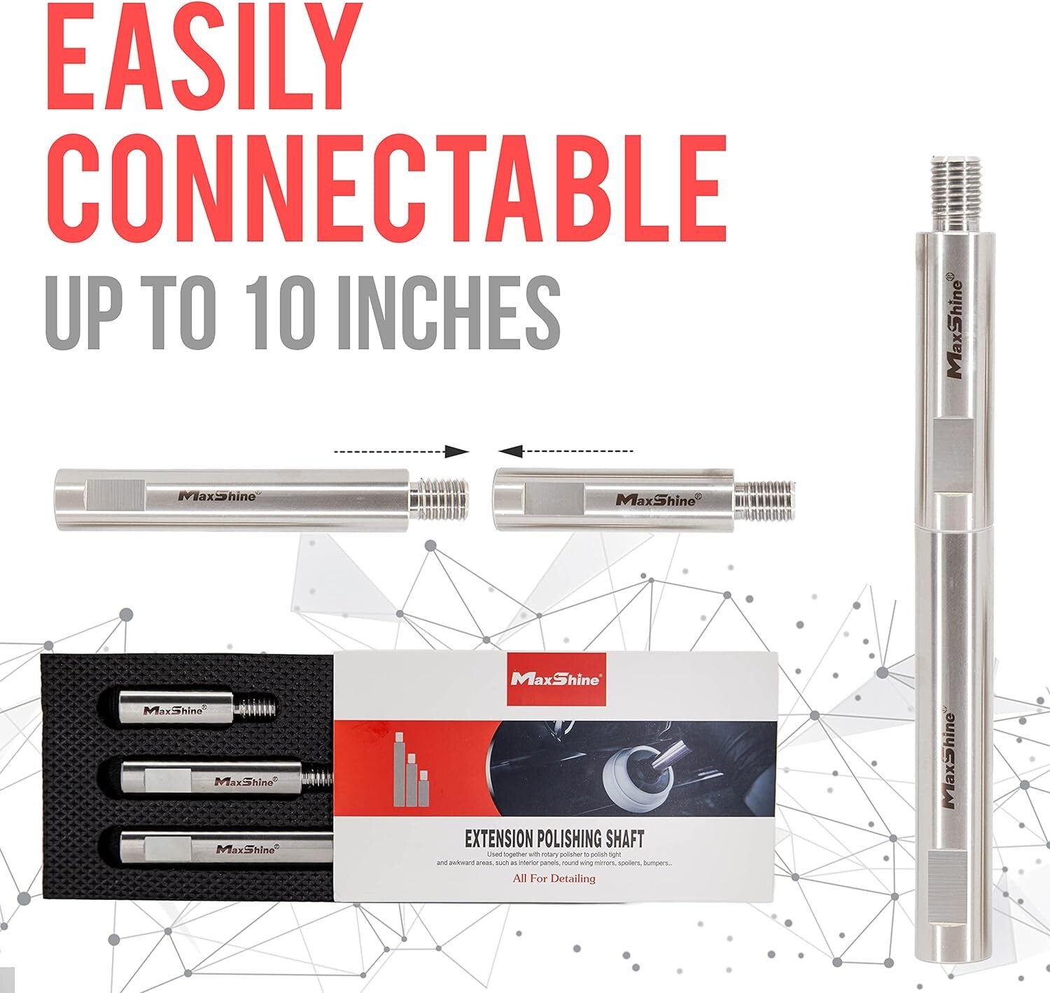 Tool-Free Assembly, Extends Up to 10 inches, Optimal length for tight spots, Car polishing and buffing, Works on wing mirrors, Works on spoilers, Works on bumpers, Fits any 5/8 inch machine, Rust proof design, Corrosion-resistant, #304 stainless steel, Easy threading by hand, Tightening with a wrench, Angle grinder extension rod