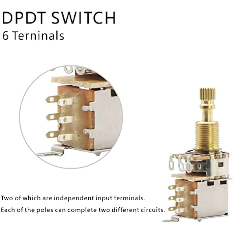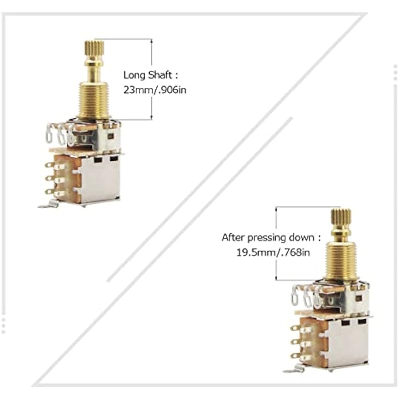 - A Type(Audio Taper), full resistance is 500K ohm, push-push pot & DPDT switch, with solder terminals.