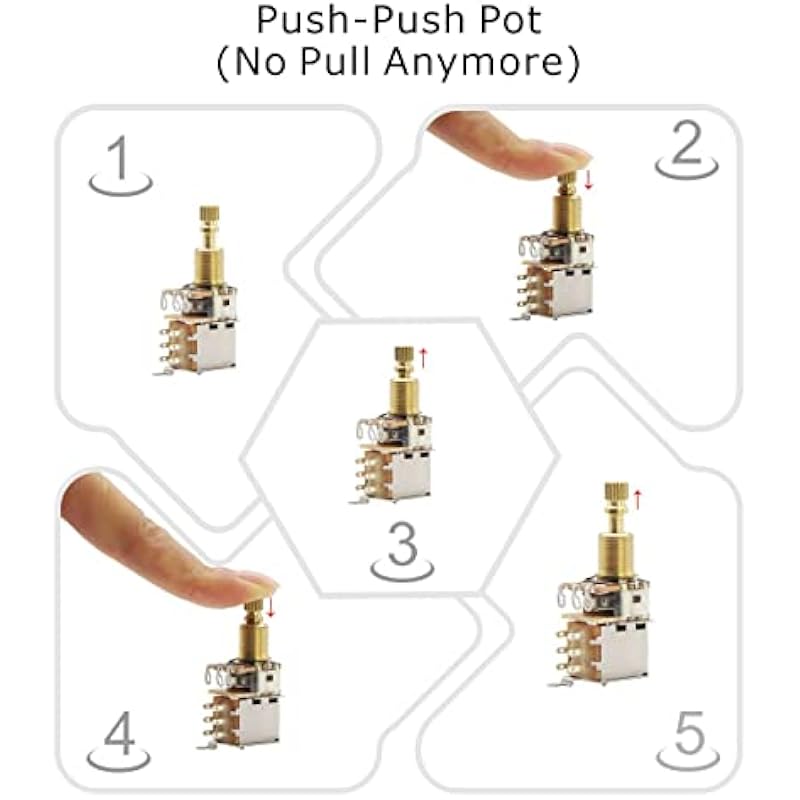 - Push & Push potentiometer, one downward touch does it all, no clutching and fumbling forever, there is no need to pull anymore, just Push & Push and play it, so much easier to use than a push/pull pot.
