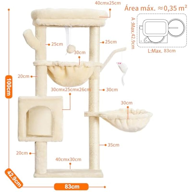 - SMALL SIZE, LARGE CAPACITY: 100cm height cat scratching tree includes cat nest, large platform, two hammocks, cat toys, etc., so that cats have more experience and space to rest and play!