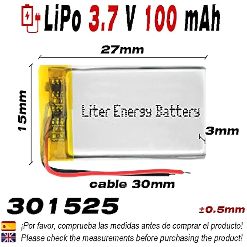 Liter energy battery 301525 LiPo Battery 3.7V 100mAh 0.37Wh 1S 5C for Electronic Rechargeable Phone Video Smartwatch GPS Watch – Not Suitable for Radio Control 27 x 15 x 3 mm (100 mAh|301525)