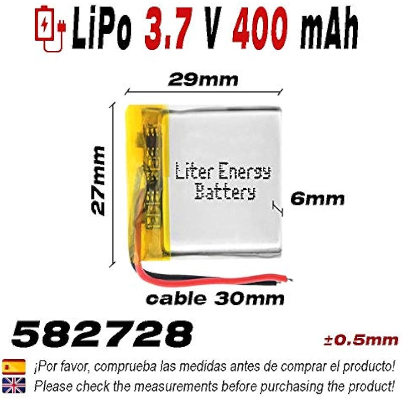 Liter energy battery 582728 LiPo Battery 3.7V 400mAh 1.48Wh 1S 5C for Electronic Rechargeable Phone Video Smartwatch GPS Watch – Not Suitable for Radio Control 30 x 27 x 6 mm (400 mAh|582728)
