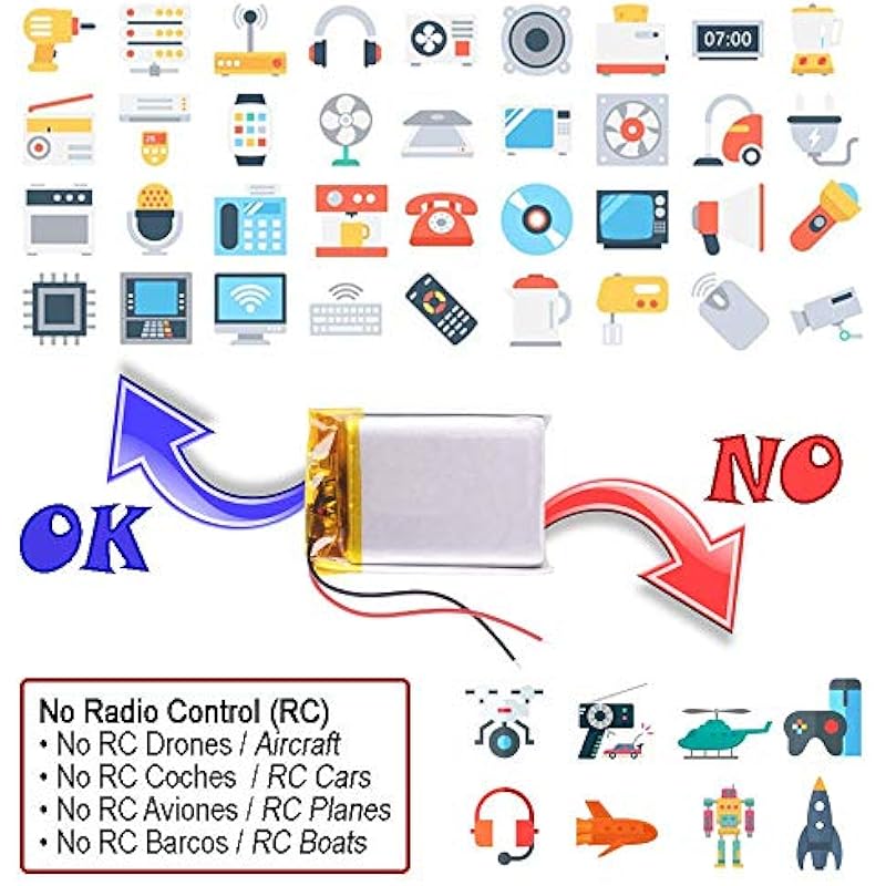 - NOT Compatible: The battery has “C” discharge rate less than 5C. The discharge rate is how fast a battery can be safely discharged. If the “C” rating is too low, the battery will not be able to deliver the current needed by the motors and the radio control device will not have enough power: RC toys, RC Drones, RC cars, RC planes, RC boats