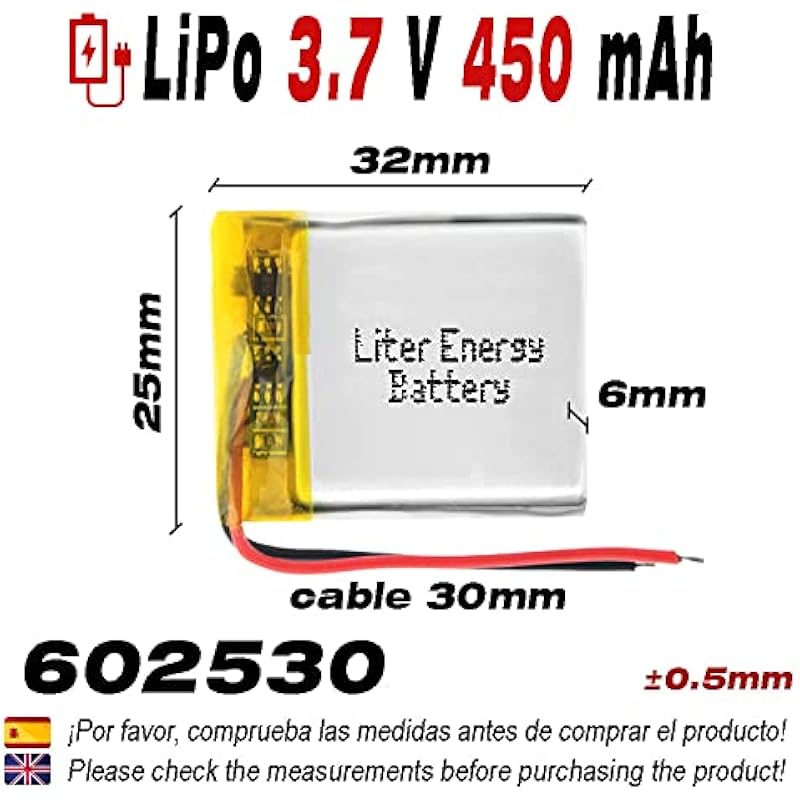 Liter energy battery 602530 LiPo Battery 3.7 V 450 mAh 1.665 Wh 1S 5C for Electronic Rechargeable Phone Video Smartwatch GPS Watch – Not Suitable for Radio Control 32 x 25 x 6 mm (450 mAh|602530)