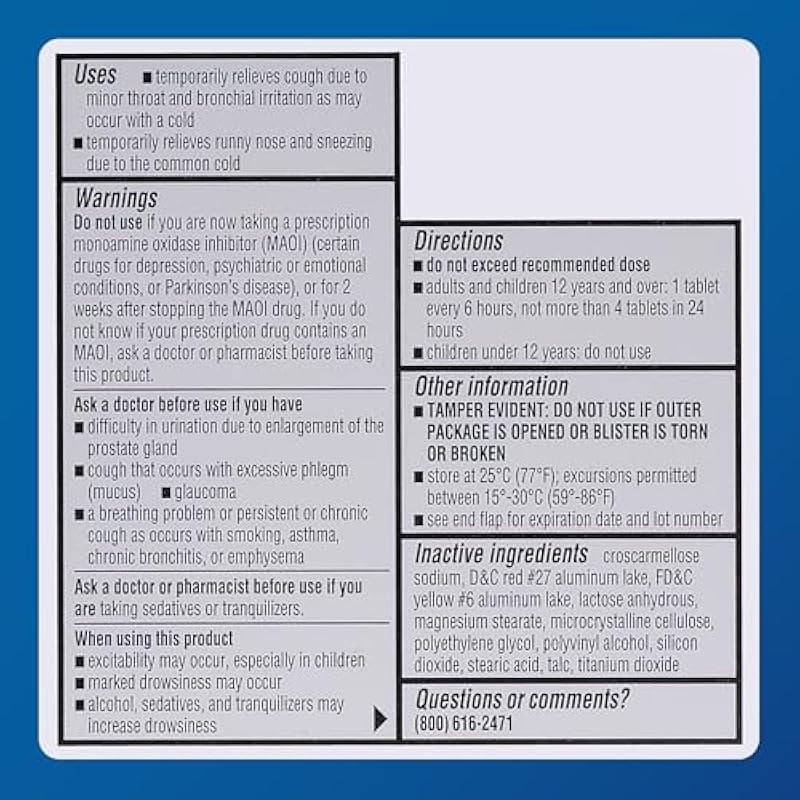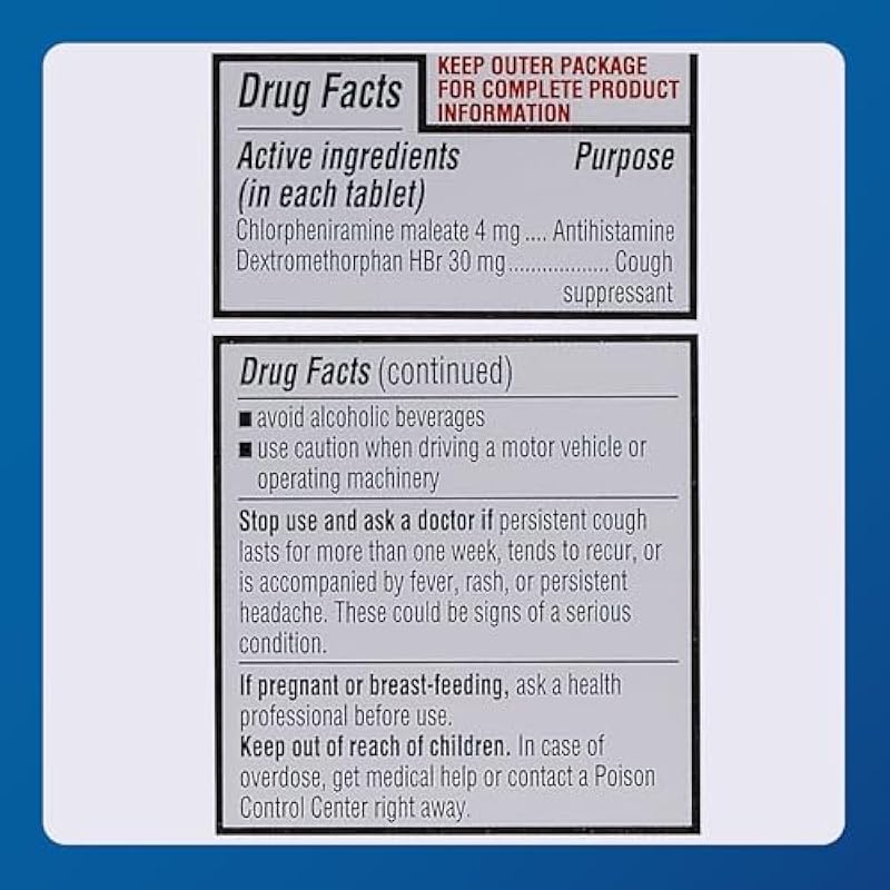 - QUALITY FORMULATION: We maintain high standards of care through strict regulatory compliance to deliver carefully formulated, effective cough and cold tablets. With a dextromethorphan and chlorpheniramine formula, our tablets may help reduce symptoms of the common cold.