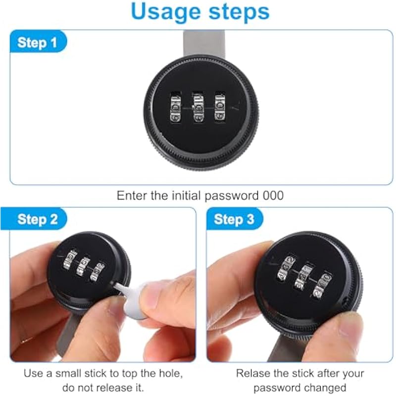 - Instructions: 1. Turn the lock to align the hole in the outer shell with the hole inside the lock body. ; 2. Use a small stick to plug the hole behind the lock. ; 3. Release the stick after changing your password. ; 4. Turning the lock counterclockwise can unlock it.