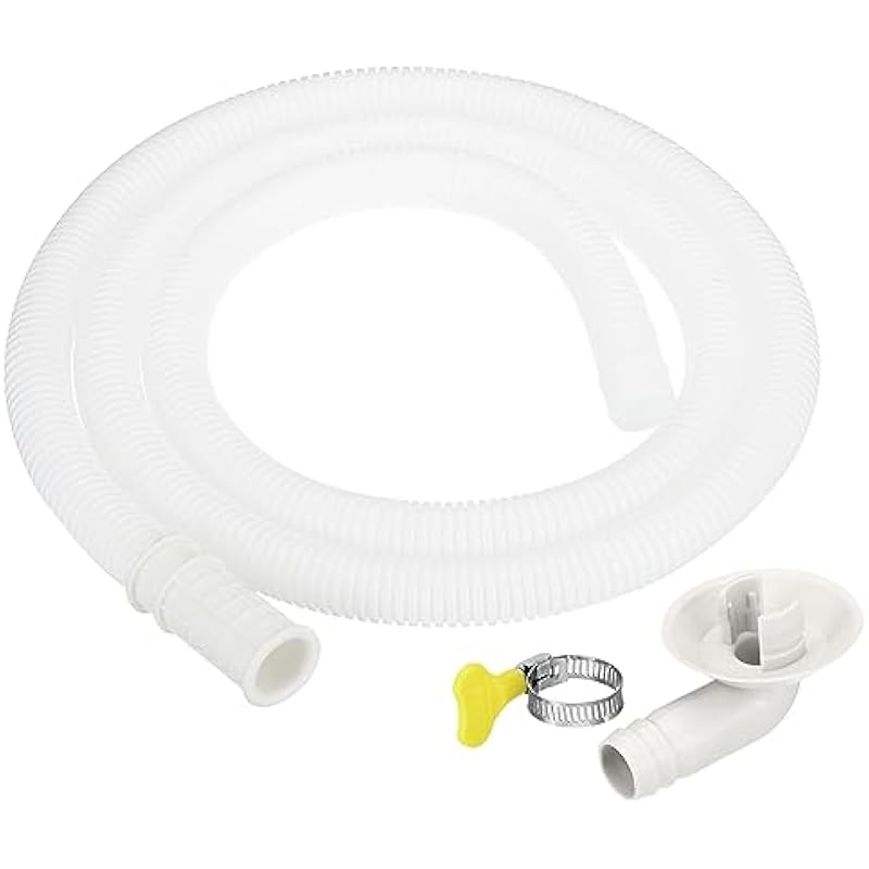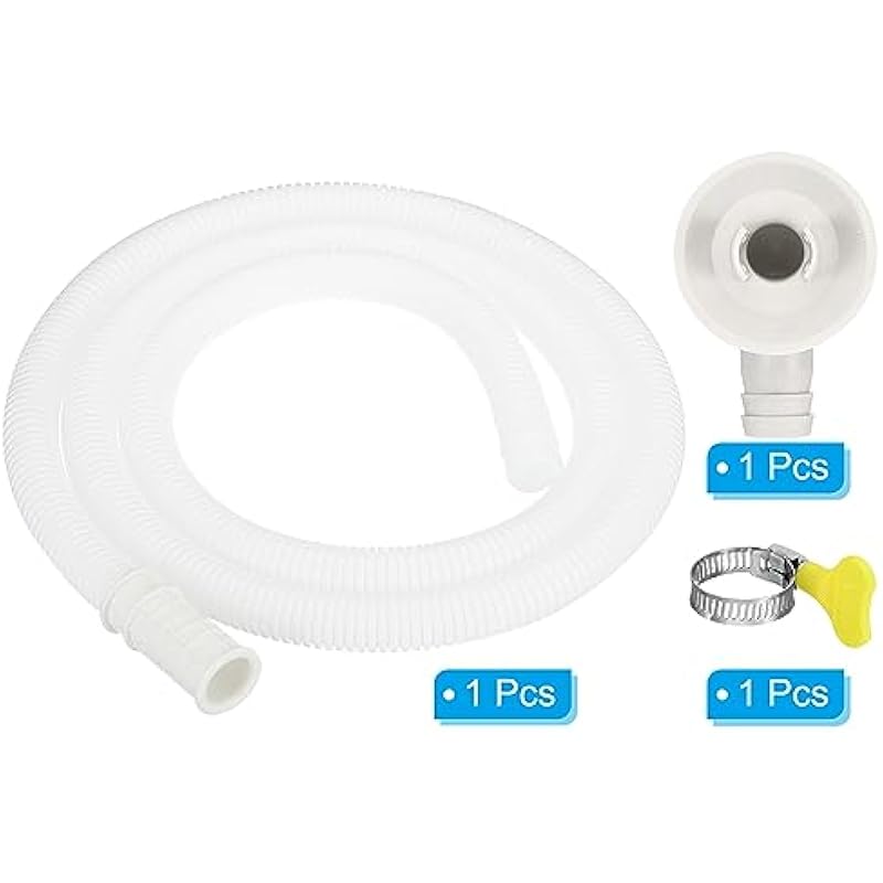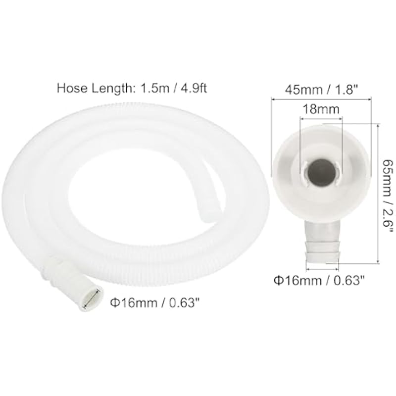 - Color: White; Material: Polyethylene; Suitable for 18mm Drain Outlet Hole; Hose Inner Diameter: 16mm / 0.63 Inch; Hose Length: 1.5m / 4.9ft; Connector Size: 65x45x35mm / 2.6×1.8×1.4Inch (L*W*H); Connector Outer Diameter: 16mm / 0.63Inch; Packing List: 1 x Drain Hose, 1 x Hose Connector, 1 x Clamp