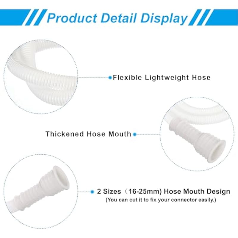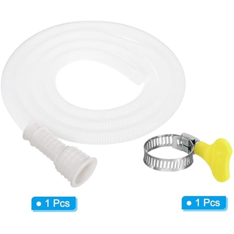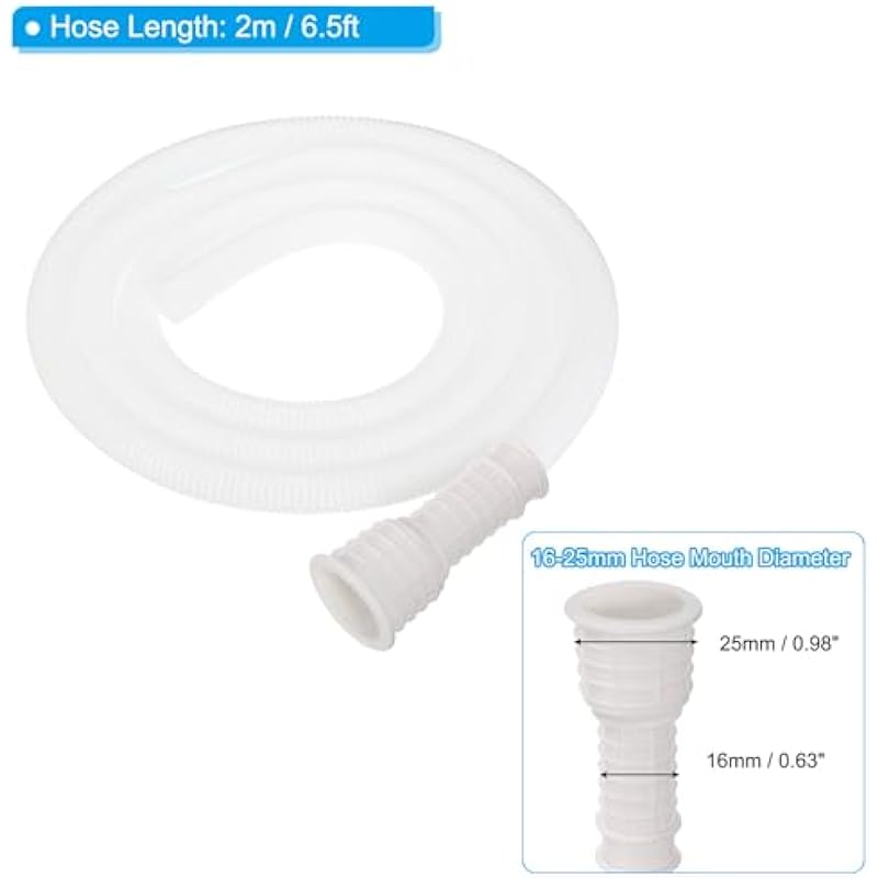 - Color: White; Material: PVC; Hose Length: 2 m / 6.5 ft; Hose Outer Diameter: 18 mm / 0.71 inch; Hose Mouth Inner Diameter: 16-25 mm; Packing List: 1 x Drain Hose, 1 x Clamp