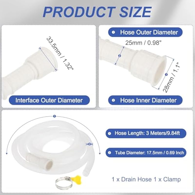 - Hose Inner Diameter 1: 25mm / 0.98 Inch; Hose Outer Diameter 2: 28mm / 1.1 Inch; Interface Outer Diameter: 33.5mm / 1.32 Inch; Tube Diameter: 17.5mm / 0.69 Inch; Hose Length: 3 Meters / 9.84Feet; Packing List: 1 x Drain Hose, 1 x Clamp (Note: Please pay attention to measuring the diameter of the air conditioner drain outlet before purchasing.)