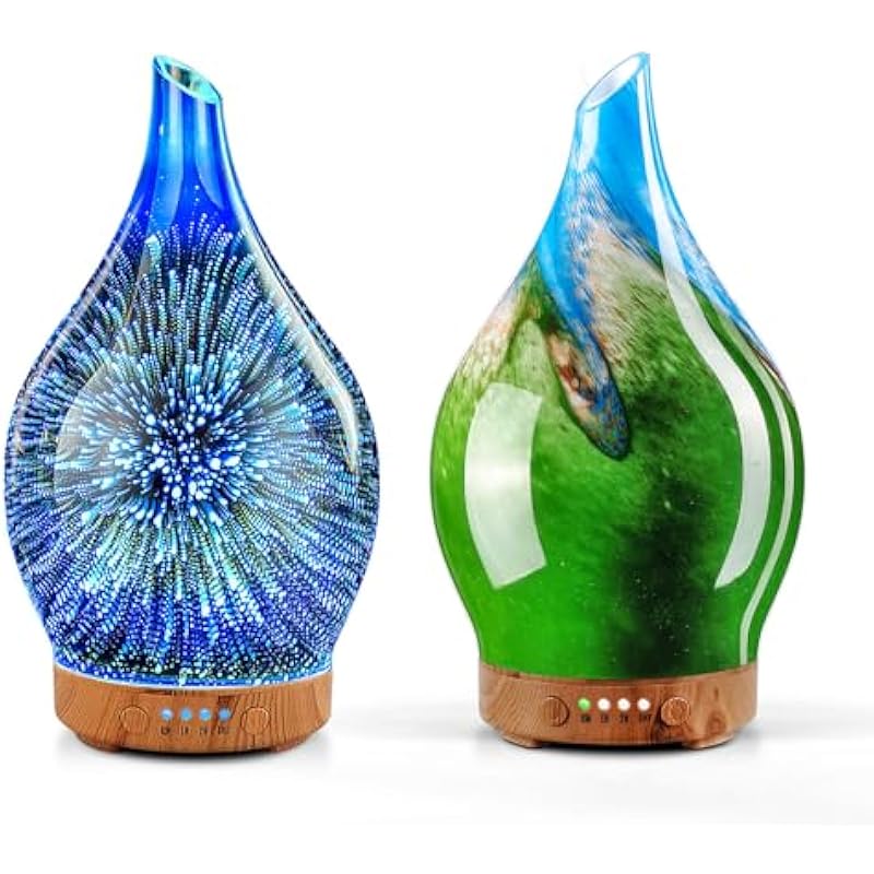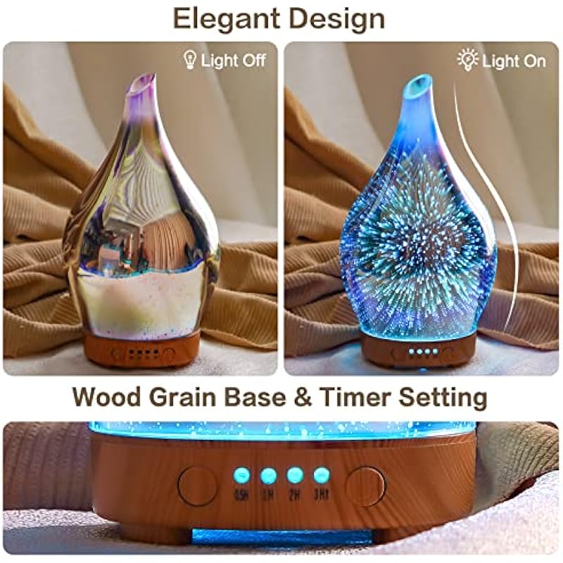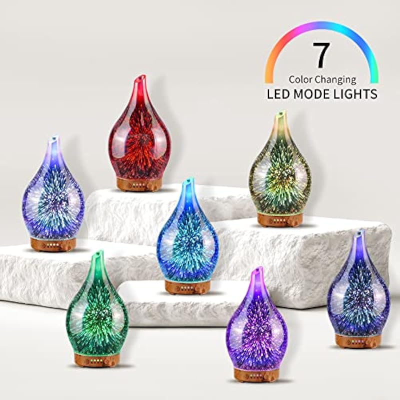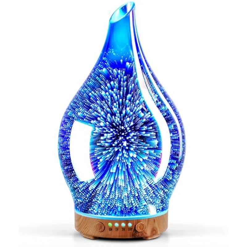 - UNIQUE ART DECORATIVE DESIGN – Our 100ml glass essential oil diffuser has a firework 3D effect glass cover and wood grain decorative base. It is very suitable for your bedroom, living room, children’s room, study room, office, and yoga room.