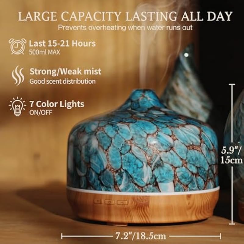 - HANDMADE GLASS DIFFUSER – Our Porseme 500ml aroma diffusers are 6.5” in diameter and 7” in height. They are handblown glass,so that each glass globe is unique. The 500ml glass diffuser is designed for large capacity which will run for 15-21 hours and it is suitable for 500-1000 square feet. You can place in any area and relax.
