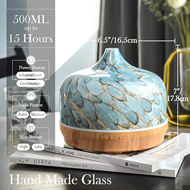 - HANDMADE GLASS DIFFUSER – Our Porseme 500ml aroma diffusers are 6.5” in diameter and 7” in height. They are handblown glass,so that each glass globe is unique. The 500ml glass diffuser is designed for large capacity which will run for 15-21 hours and it is suitable for 500-1000 square feet. You can place in any area and relax.