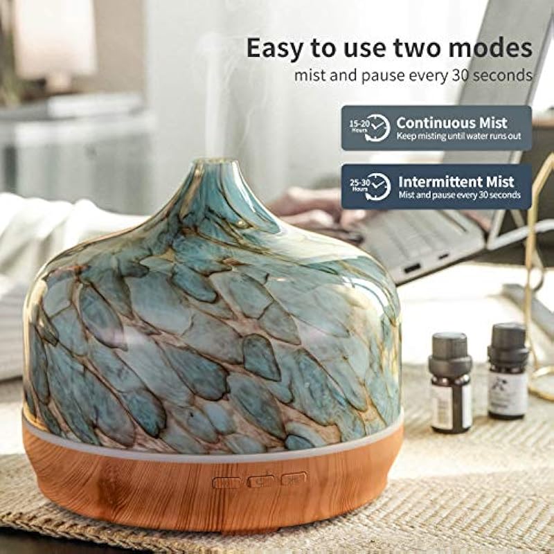 - 2 MIST MODES – This large capacity oil diffuser comes with 2 mist modes: continuously spray and interval spray. Continuously mist can run around 15 hours and interval spray (stop each 30s) will last around 21 hours.