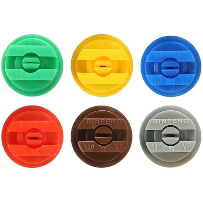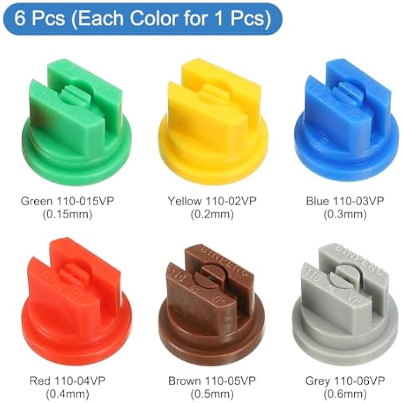 - [SIX DIFFERENT SIZES] – Each set includes nozzle tips in six different sizes to accommodate different tasks. Sizes include Green 110-015VP (0.15mm), Yellow 110-02VP (0.2mm), Blue 110-03VP (0.3mm), Red 110-04VP (0.4mm), Brown 110-05VP (0.5mm) and Grey. 110-06VP (0.6mm) Choose the right size for your specific spray requirements.