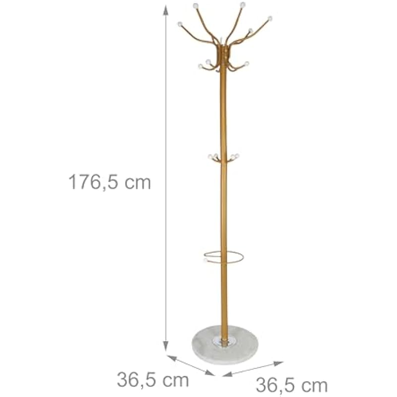 Relaxdays Coat Rack with Umbrella Stand, 16 Hooks, 176.5 x 36.5 cm, Marble Base, Coat Stand, White