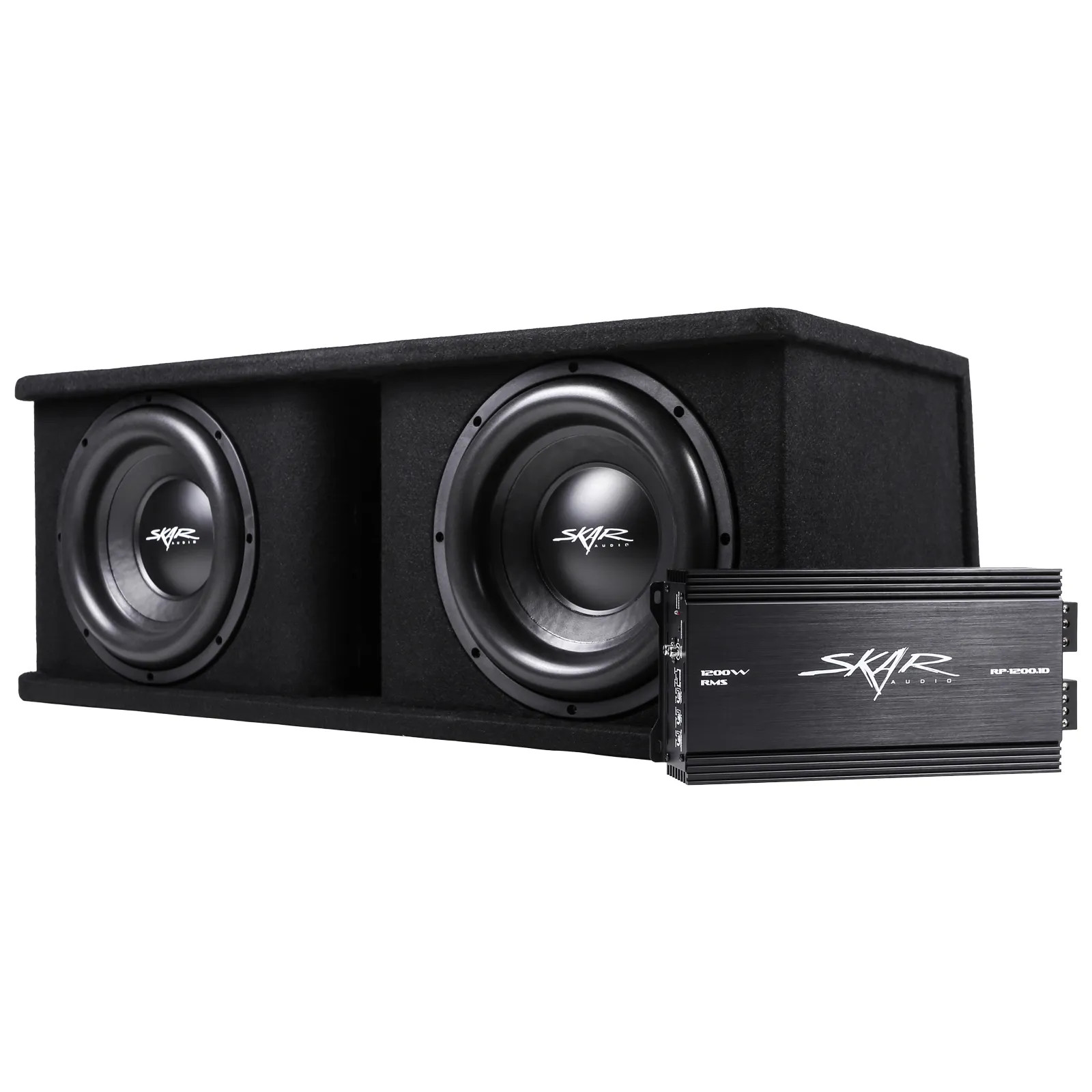 SKAR AUDIO DUAL 12″ 2400W SDR COMPLETE BASS PKG LOADED SUB BOX – AMP – WIRE KIT