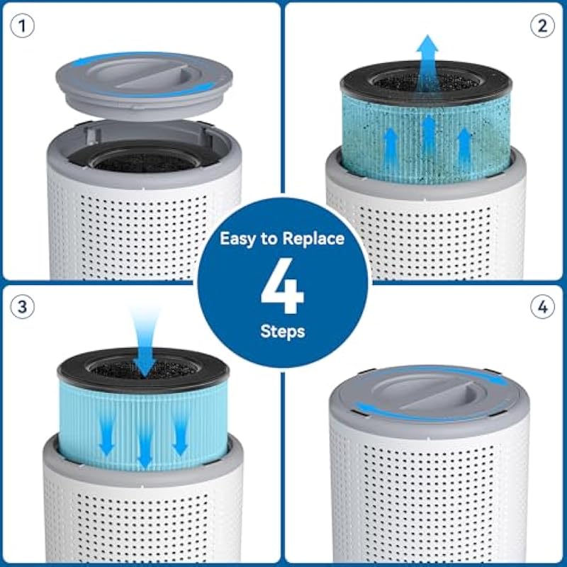 - [Easy to Replace] Simple to replace the filter as the steps below: 1. Flip the air purifier upside down and rotate the bottom cover 2. Remove the cover and the used filter, and replace them with a new filter 3. Place the bottom cover back onto the machine and twist it clockwise until you hear it click in place 4. Press and hold for 3 seconds to reset the filter indicator.