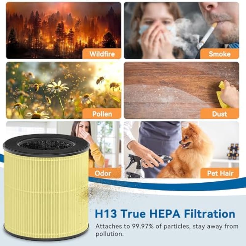 - [Better Air, Better Life] The replacement filter features 3 in 1 filtration System: Pre-filter, H13 true HEPA filter, and Charcoal filtration system work together to purify 99.97% of 0.3-micron particles from dust, pollen, pet dander, smoke, cooking smell, hair and odor. Effectively improve indoor air quality and create a healthy environment.