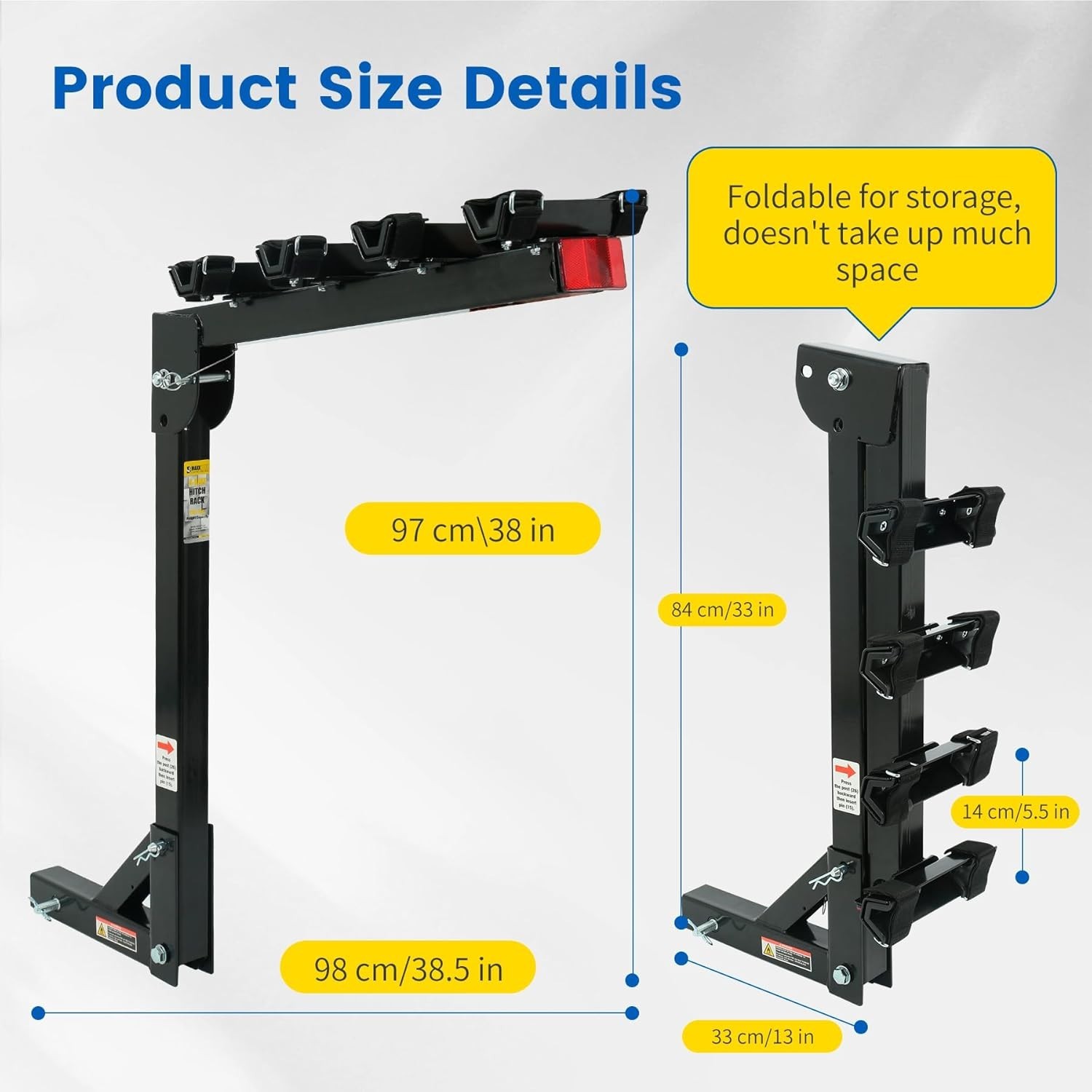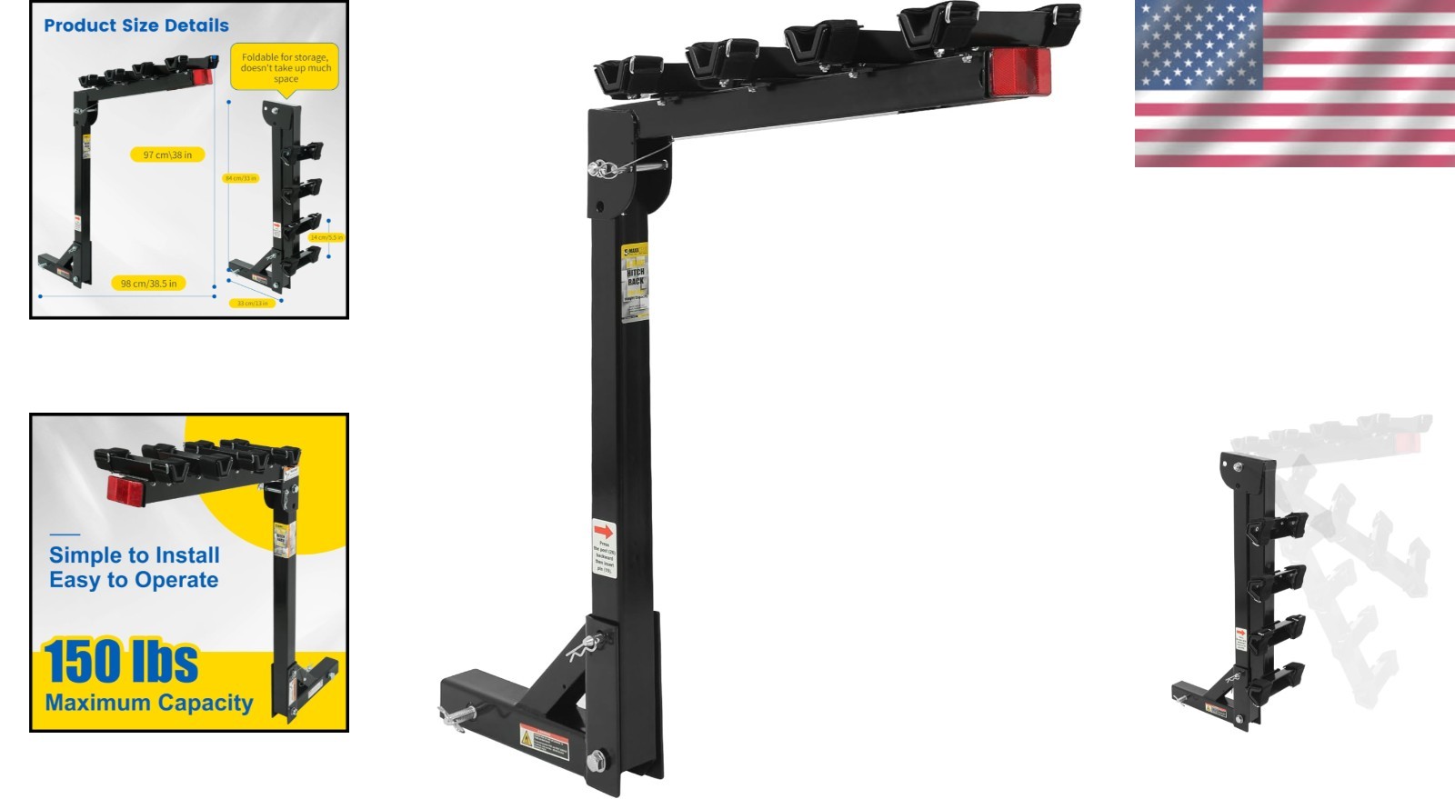 Anti-Theft Lock, Secure Bike Transportation, Swing-Down Feature, Easy Installation, Broad Hitch Compatibility, Durable Construction, Compatibility Note, Weight Limit and Reflector