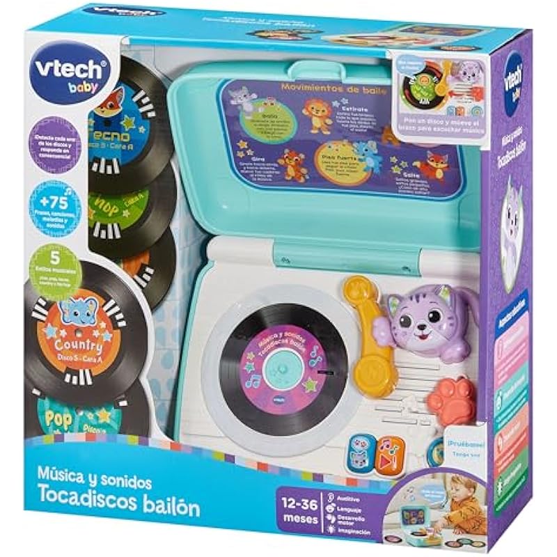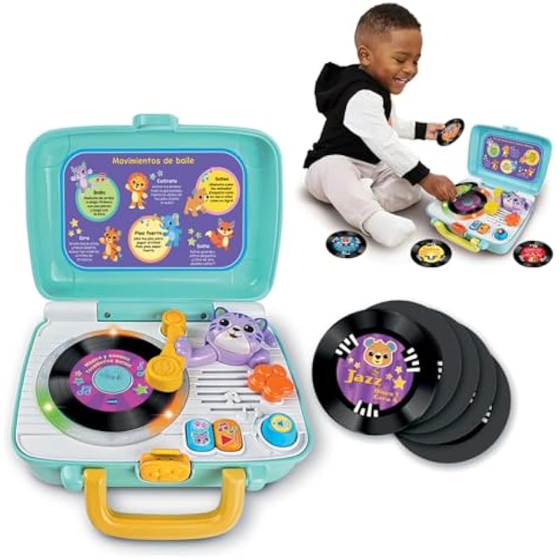 VTech -Baby Music and Sounds Dance Turntable, Interactive Children’s Player, 5 Double-Sided Discs with Animals, Phrases and Songs, Teaches Musical Styles, Portable Case, ESP Version