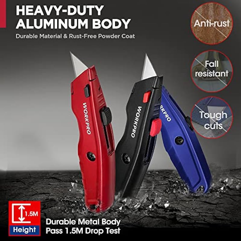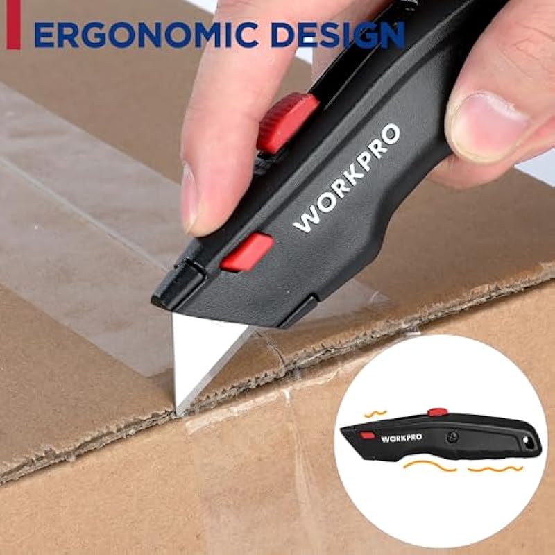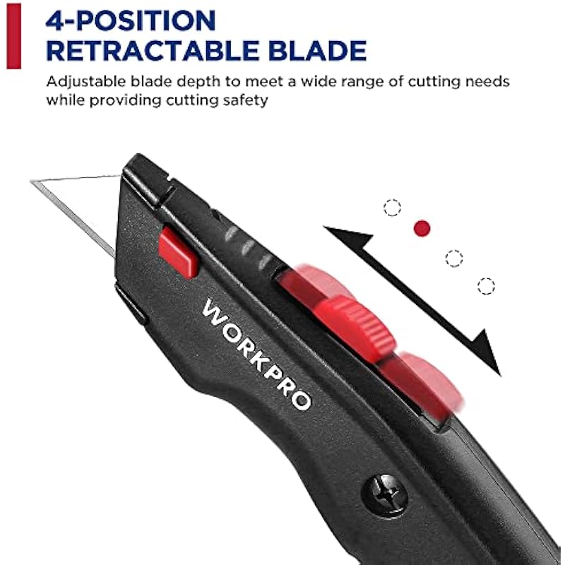 - EASY TO CARRY – WORKPRO safety knife has 4 cutting depth positions to meet different cutting needs. Weighing only 90 g, the size of 158 x 21.3 x 42 mm can be easily stored in the pocket, perfect for carrying